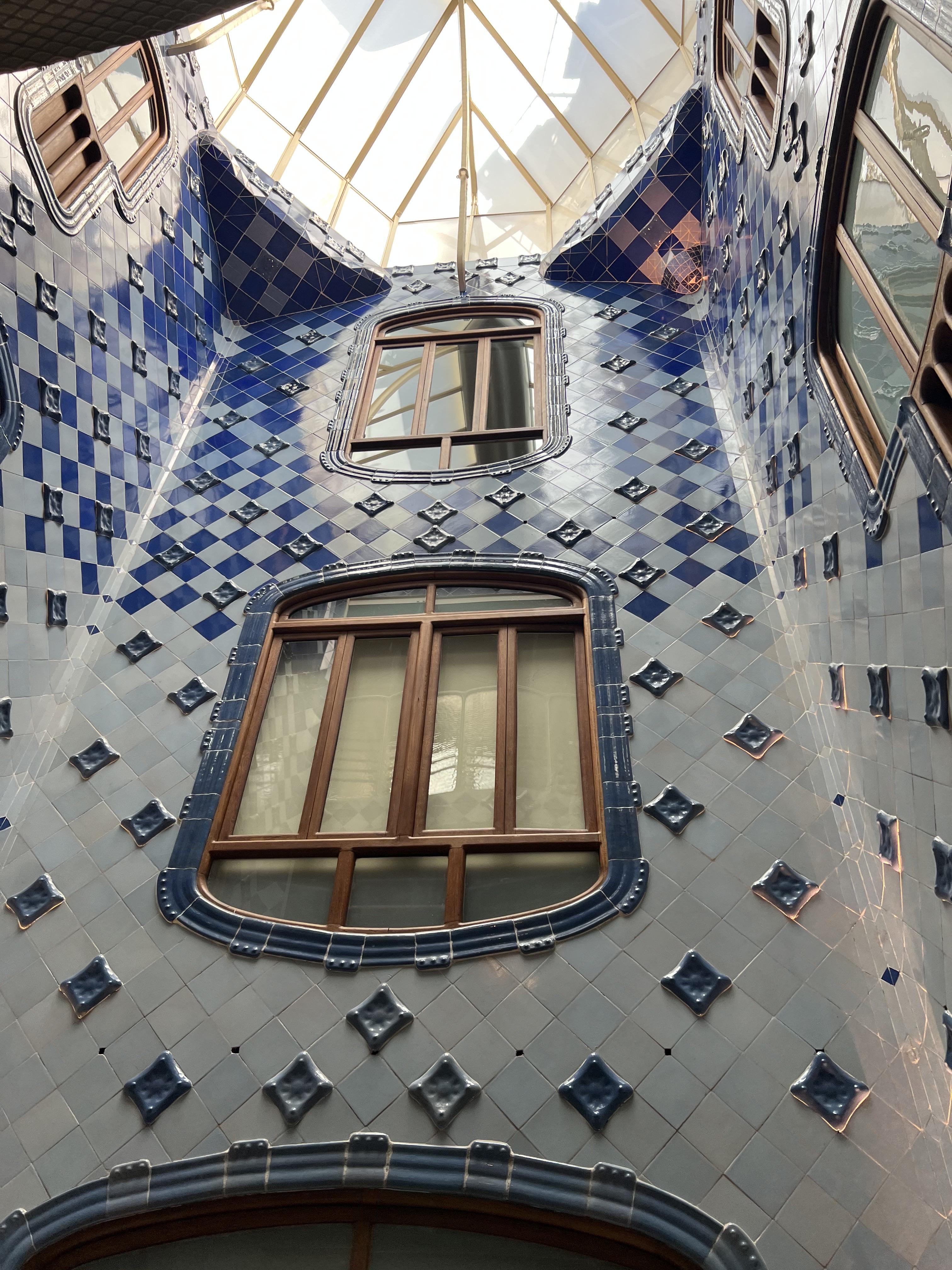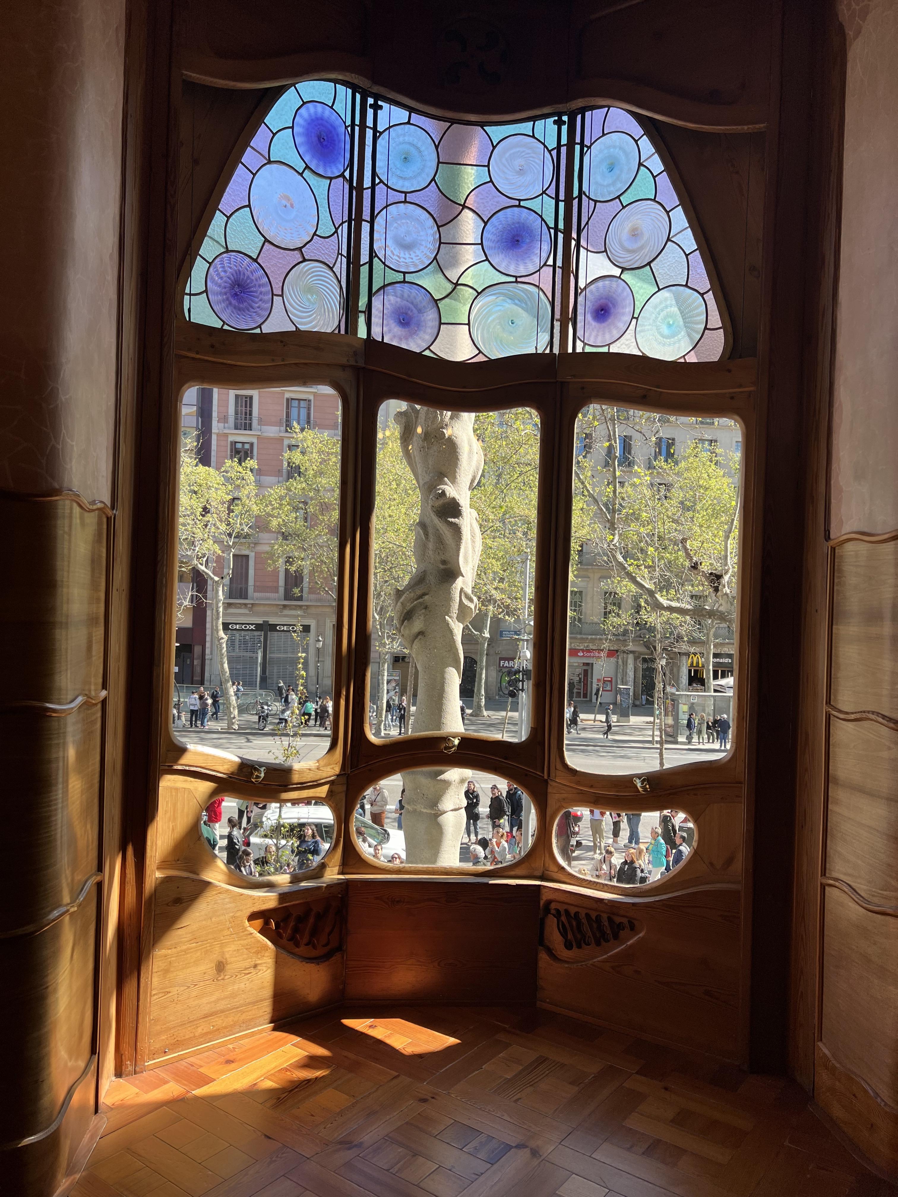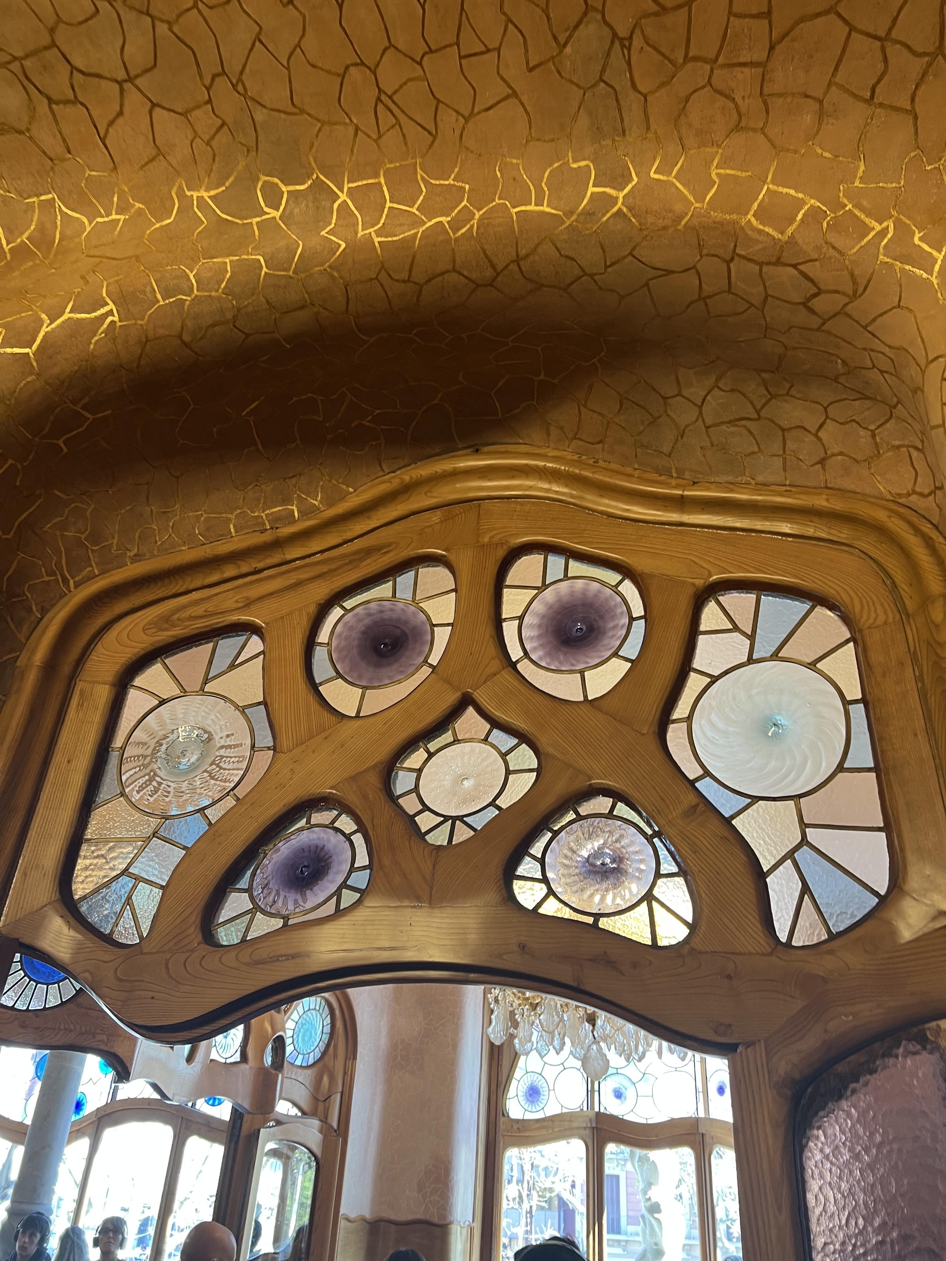 까사 바트요는 그라시아 거리에 위치한 가우디의 또 다른 건물입니다. 새로운 건물을 세운 것이 아닌 바트요의 낡은 건물을 리모델링해서 최대한 튼튼하게 만드는 것에 집중했다고 합니다. 창틀과 창살은 뼈를 모델로 하고 발코니는 해골의 눈부분을 닮았다고 합니다. 내부의 푸른 스테인드글라스가 바다에 들어와 있는 느낌을 주며 지붕은 용의 등을 표현했다고 합니다. 실제 실내 내부가 이렇게 만들어진 것이 믿기지 않을 만큼 재미나고 신기하게 꾸며져 있었습니다.